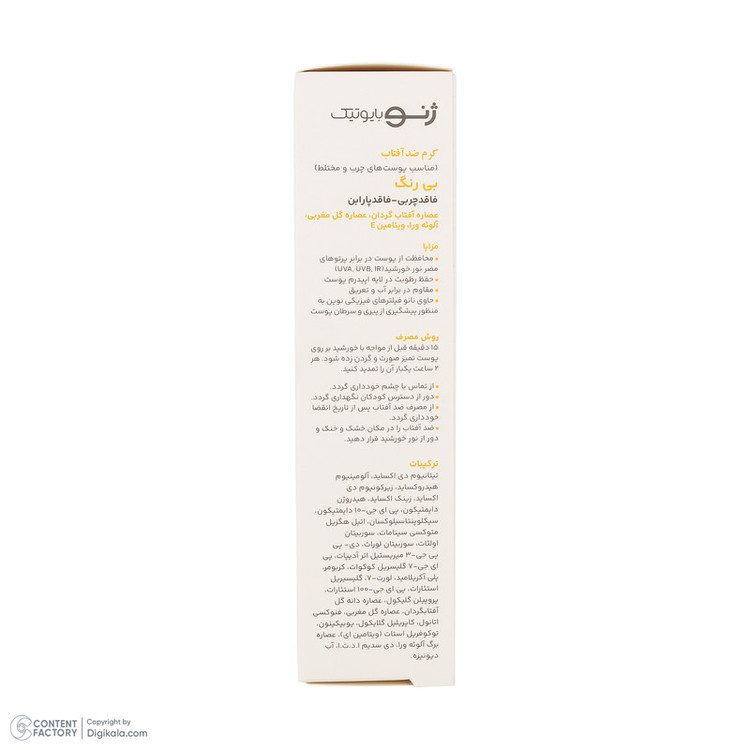 ویژگیهای ضدآفتاب : ضد آب , محافظت کننده در برابر اشعه UVA , محافظت کننده در برابر اشعه UVB , ضد حساسیت , غیر کومدون زا , مرطوب کننده , فاقد پارابن