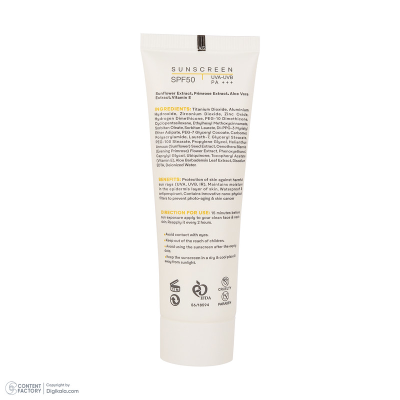 ویژگیهای ضدآفتاب : ضد آب , محافظت کننده در برابر اشعه UVA , محافظت کننده در برابر اشعه UVB , ضد حساسیت , غیر کومدون زا , مرطوب کننده , فاقد پارابن