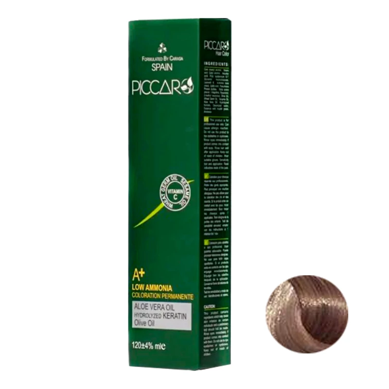 رنگ مو پیکارو حاوی کراتین , روغن کنجد , روغن بادام , روغن زیتون , ویتامین E , C , B , نرم کننده , جوانه گندم , عصاره آلوئه ورا و کراتین هیدرولیز شده می باشد که موجب آبرسانی , درخشندگی و شفافیت مو ها می شود و از خشکی و شکنندگی مو ها جلوگیری می کند. از سایر ویژگی های رنگ مو پیکارو می توان به ماندگاری و دوام طولانی و پوشش یکنواخت سفیدی مو اشاره کرد. رنگ مو پیکارو دارای حداقل میزان آمونیاک است.