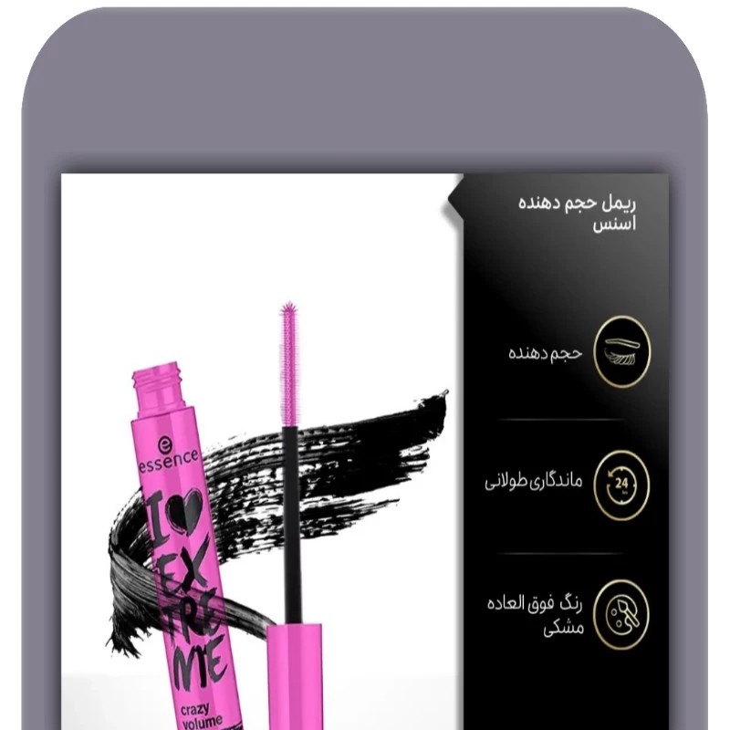 ریمل اسنس (Essence) مدل I Love Extreme Crazy Volume Mascara با رنگ کاملاً مشکی و برس انعطافپذیری که دارد، حجم قابلتوجهی به مژهها میدهد و برای افرادی با مژههای کوتاه بسیار مناسب است. این محصول با بافت کرمی مانندی که دارد، برای پوشش تمامی مژهها بسیار مناسب است و از چسبندگی مژهها به هم نیز خودداری میکند. در ضمن این محصول برحسب ترکیباتی که در آن بکار رفته میتواند به آبرسانی و تقویت مژهها نیز کمک کند. مزایا: • رنگ فوقالعاده مشکی •عدم ریزش مواد • دارای بافت کرمی • حالتدهنده •دارای برس پلاستیکی • جلوگیری از چسبیدن مژهها به یکدیگر • ماندگاری بالا • دارای فرمولاسیون سبک • حجمدهنده
